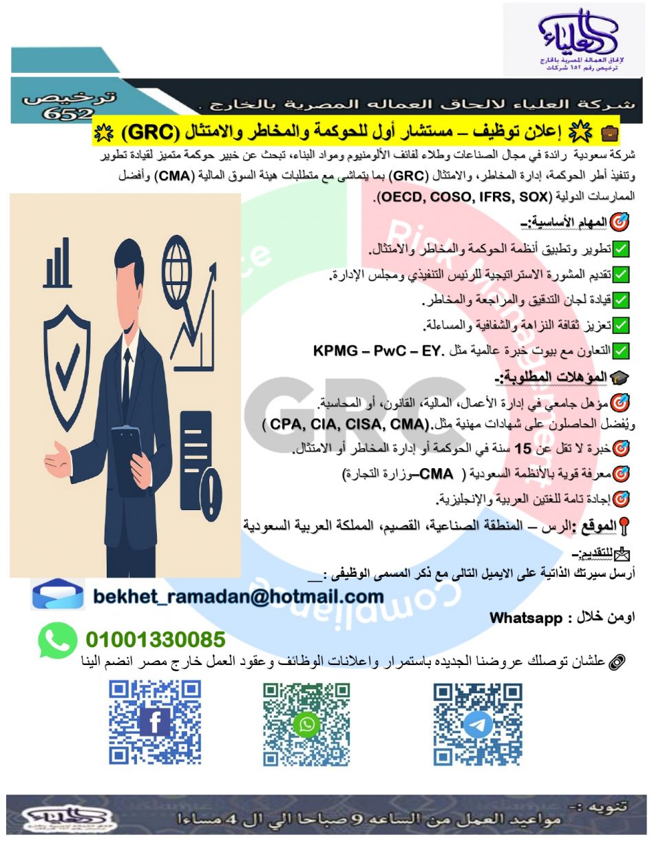 💼 🌟 إعلان توظيف – مستشار أول للحوكمة والمخاطر